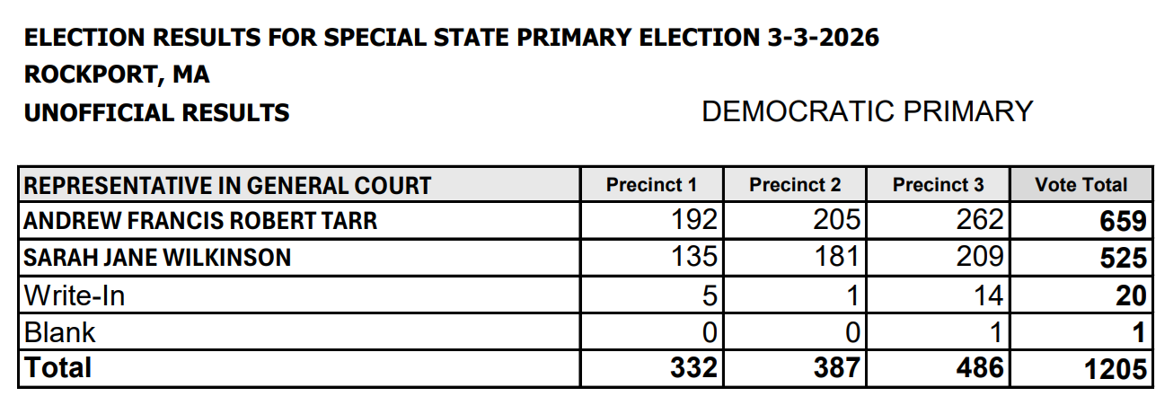 Thanks to everyone who voted on the Democratic ballot. From the elections page on our Town website, here are the results for Rockport.
